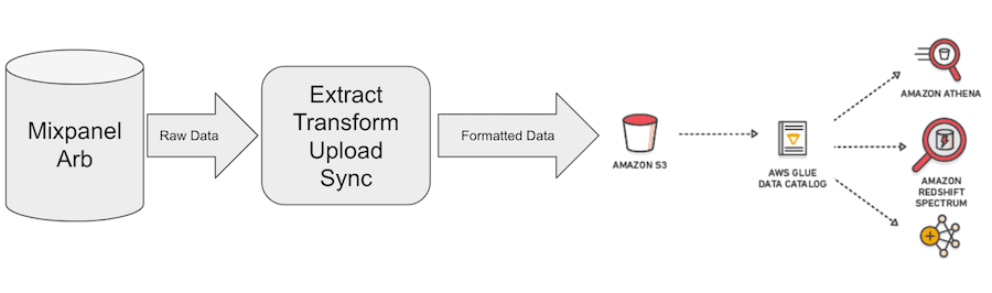 Mixpanel applies transformation rules to make the data compatible with data warehouses and then transfers the transformed data to your S3 bucket. You can then choose to use a Glue crawler to create the schema out of the transformed data or let Mixpanel to directly create the schema in your glue database. Having the data and the glue schema in place, you can use SQL with multiple AWS products, including Amazon Athena and Redshift Spectrum, to query the imported data.